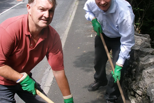 South Lakeland MP Tim Farron rolled up his sleeves and spent yesterday afternoon with Grange Lengthsman John Gilmore cleaning local footpaths and inspecting roads and walls in the town.